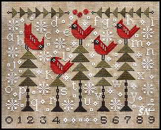 Cranberry ChristmasThis is kind of a festive little piece! Check out the awesome trees - they each have snow on ONE SIDE! Kind of an elegant presentation, stitch your family name where the date was, and maybe a greeting down on the row with the cardinals. Coded for DMC or Weeks hand-dyed flosses of Pamlico, Onyx, Grits, Oscar, Red Rocks and regular ol' 349! Finishes approx 8-1/2 x 12 n 36ct - so quite generous in size. | |