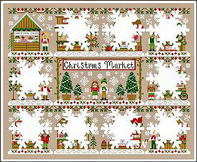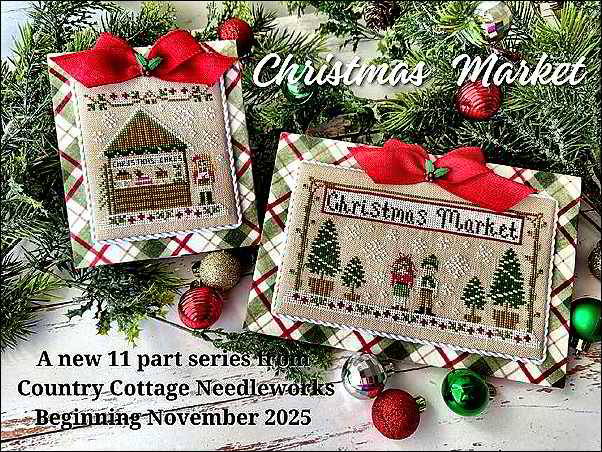 Presenting Country Cottage Needlework's Christmas MarketWe have a new series from Nikki that promises to be absolutely charming! Our first design is the title/banner scene for the 11-part little outdoor Holiday market. It is available now, so you can get started. Subsequent charts release monthly (we think they're all going to run $7.00 each.) till September 2026. Each small design measures 55 x 59, but the entire piece (kind of shown in the composite teaser pic) measures 223 x 179. Choose your fabric count, then color. This is on Beautiful Beige, but we think Natural will showcase your white snow much better. On 32ct, it will measure about 14 x 11, so a fat quarter of linen will do nicely. You'll need to purchase threads all at one time, as you'll need multiple skeins of some: Classic Colorworks Bamboo (7), Wagon Wheel (4), Caroling (2), Mistletoe (2), Little Sprout (2), Hazelnut (2), Cherry Tomato (1), Queen Bee (1), Caterpillar (1), and Tea and Bisquits (1).We love the fact that each stand is going to be different from the others... it looks like there will be some quaint details in here - can't wait! Join our auto-ship to collect all the charts as they release! | ||