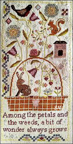 - Among the Petals - This is house #4 of a set of 6 designs. We have #1, Bramble Cottage, but apparently I have missed the previous 2 designs in this set! Will work on that, but in the meantime, this is a very pretty Springtime pic. Bunny, snail, a squirrel, lots of flowers and that huge basket, this measures 120 x 243 - part of a much bigger piece! Coded for hand-dyeds or DMC.