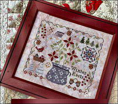 - Winter Rests - This companions Autumn Gathers. Same perky little pot, this is surrounded with evergreens, mittens cardinals, pine cones... very pleasing to the eye. Coded for hand-dyeds or DMC, it measures 145 x 125 - so 8 x 7 on 36ct.