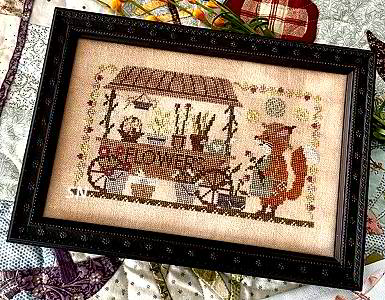 - Hazel's Blackberry Burrow - How cute is that little teapot house? Hazel must have picked blackberries after she'd finished her laundry, what a fun little scene. 163 x 100, Chart $14.00; it is coded for a medley of hand-dyeds with DMC conversions.