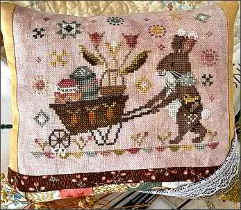 - The Postbunny's Easter Delivery - Remember Postmouse's Christmas? Well, this is the Bunny from the Post Office delivering a wheelbarrow full of fancy eggs and blooming lilies. Measuring 98 x 77, Lori chose a pink-ish hand-dyed as her background - but many other pastels would probably do, too. Coded for hand-dyeds or DMC, just a sweet piece. Chart runs $12.00.