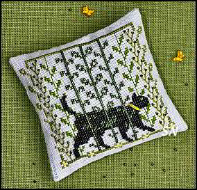 Strawberry Thief Oh my gosh, this is the sweetest design! The thief-cat is BEADS and so are the strawberries! Presented as a color chart ($9), this finishes approx 3-1/2 inches on 32ct. The blackbirds on the edges are watching that darling little black cat - who is stitched with Mill Hill petite glass beads - stealing a plump strawberry - which is also stitched in beads! There are some straight stitches on leaves for a little more interest - making this whole thing tiny and precious! Stitched on a light blue 32ct - you'll need that size - or 36 - to fit the beads (42014, 42031 and 42013.) | |