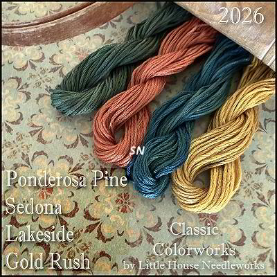 ![]() Spring 2026 New Classic Colorworks Hand-dyed Flosses Ponderosa Pine, Sedona, Lakeside and Gold Rush are the 4 newest shades... Ponderosa Pine is used in Little House Needlework's newest 'Winterville' series. | |