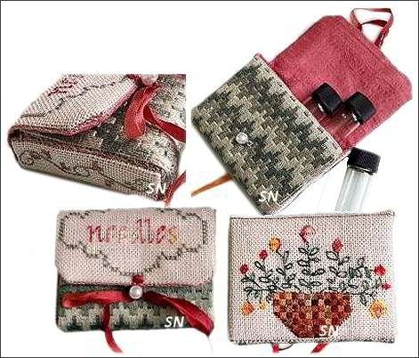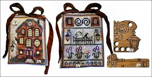 OctoberI love this one! A linen sewing case all decorated with birds and bats, spiders and pumpkins, this is worked on Picture This Plus 28ct Regency linen with Rainbow Gallery silks. Inside, you'll get to store a tiny thread catching hook that you've embellished with a beaded dangle, a thread winder and ruler, and your beaded trim edge will be stunning. It is made with the most gorgeous frosted teardrop beads in every shade of copper and lavender-brown. You even get the printed lining material in here. The matching fob has an intoxicating bag of amber, orange and copper crystals and frosted beads. You'll make the little kitty, the moon with the bat flying across it, and those threads sticking up are spiders!!!!! Great colors in this set., both are offered individually as complete kits. | |||
