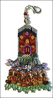 Spooky Night Sewing Case and Beaded FobThis is a study in black and grays. The sewing case is stitched on 28ct Thunderstorm linen with Treenway Silks, there are spider, and little 3-D skull charms in here -- just *charming!* Complete kit contains the fabric, linings, silks, beads, ribbons... everything to make this faux-elegant case! Can you see the crystal chandelier on the cover??? It has tiny black beads dangling from it!!! The Spooky Night Fob is all gray and purple! The Peyote beaded part is a grave stone but the fringe is the exciting part! It has that open casket dangling... and more of those 3-D skull beads! Just the funniest thing... this fob is a MUST HAVE even if you get nothing else to match it this time around! | |||