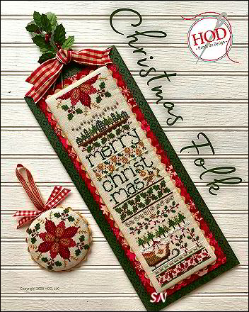 - Christmas Folk - Cathy describes this with Poinsettias, Putz houses (I don't know what those are!), pears and a partridge. Classic holiday motifs with a touch of folk inspired design. It measures 53 x 190, finishing about 3 x 11. Stitched with DMC floss, it's the same design style as the Seasonal Folk Samplers Cathy has done.