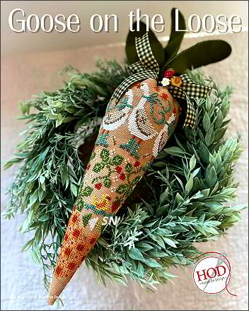 - Goose on the Loose - This year's huge 20ct berry... last year we had carrots on the berry, this year we have berries on the carrot! This is part of Cathy's BAP Series - Big Awesome Produce. Stitched on 20ct linen with #5 Pearl Cottons, just a fun and unique finished project! Chart runs $12.00 and includes that private link to the all-knowing Finishing Tutorial online.