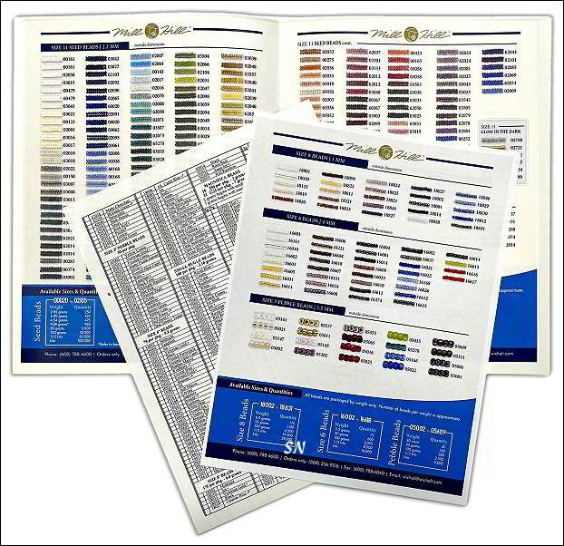 ![]() Mill Hill Glass Bead Fliers from Mill Hill These are full color inventory sheets along with numeric listings and correct color names for all the Mill Hill beads. They're only $1! The recent 2023 updated printing tells you the approximate quantity in the different packs. The full color pages group the beads by color families. The printed numeric listing is organized in that numeric order. During Covid, MH discontinued Magnifica Beads. You might still be looking for some of those, so this list has the pics and numbers for reference even though we cannot get them. Truly an invaluable reference, get copies for all your friends –'cause they're only ONE DOLLAR each. | |