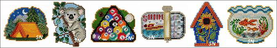 These make charming Christmas Ornaments because they finish just 3 inches in size, and they cover every interest and hobby out there, it seems! Complete kits include the chart, PVC, needles, beads and threads. We have a cute little camping tent, a happy little Koala Bear, a rack of billiard balls, a can of sardines (these are perfect if you've traveled to Portugal!), a sunflower bird house, and sweet little goldfish bowl.