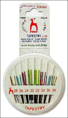 Pony Colored Eye Tapestry Needles - Love these too! These are nickel-plated steel needles - with colored eyes! You can tell by looking at them what size your needle is! The #24's have a black eye - which is actually very easy to see. The #26 has a teal eye, and the teeny-weeny #28's have a red eye! We have these in an assortment pack of 2 each #24, 26 and 28, and single-size packs of 6 needles each as well. (#28's have 5 in the pack vs 6.) Look at the size difference of the Red Eye #28 needle! It is next to a John James #28 gold tapestry needle! It is definitely smaller! | |