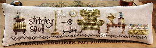 - Vintage Stitchy Spot - Oh the big soft chair, the knitting and the quilt... I love the little lamp! Just a cute teeny 8 x 1 cushion to stitch in a jiff! Chart runs $8.00