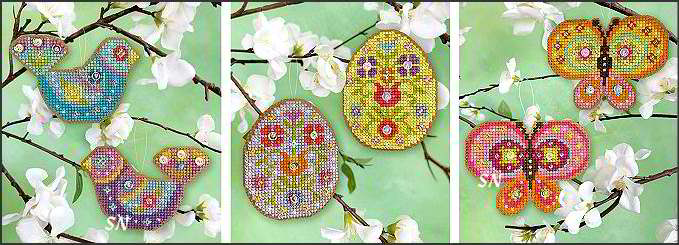 Aren't these Springy and cute? By Satsuma Street, these are new kits that make little ornaments. 14ct Perforated paper, all the necessary flosses and a few sequins tossed on for glamour... these are fun to tuck into Easter Baskets or bowls of eggs and cushions, or hang in your windows! Each finishes approx 2 x 3.