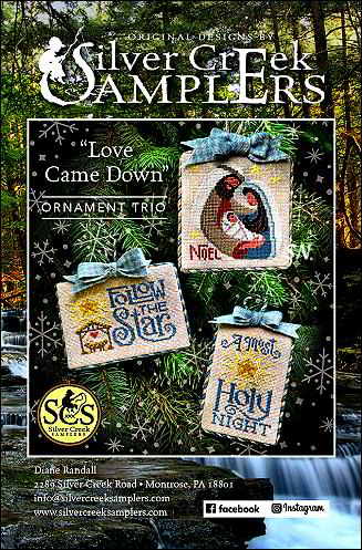 - Love Came Down - An Ornament trio, this is really nice. The Holy Family looking modern - perfect for a 'younger' family as it doesn't 'look classically old!' Diane is all about words and verses... so has tossed in a pair of sentiments to go with this. Choose any neutral fabrics, all three designs in the chart $14.00