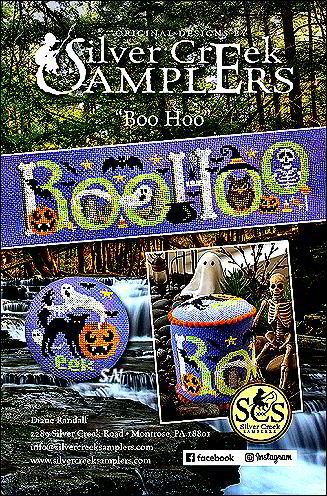 - Boo Hoo - LOVE THIS! Choose a rich purple background (we have a million different fabric choices) to stitch this bright and colorful greeting. DMC and Weeks flosses, there is so much charm in each of these letters. You can frame this, make a flat standing board, or finish into that little drum shape... that round 'EEK' design is the top of that round drum. Chart $13.00