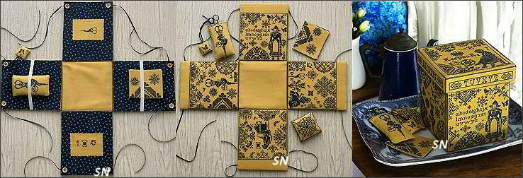 ![]() Stitching Summer Smell the Sea and feel the Sky - just don't get sand in your stitching bag! This is kind of a fun piece by Twin Peak Primitives... I see three bands of design in here... so lots of possibilities. The top row features spools of thread with those shorebirds, bitty cabanas and the fishermen on them. Notice the clothesline there with the scissors and needles on it? (and the bitty swimsuit!) The crabs are super cute, and the row of whales down below just makes it a busy sea-scene. Presented as a leaflet, the stitch count is 170 x 119 - so 10-1/2 x 7-/12 on 16/32ct, and it calls for regular DMC floss. Easy to add some hand-dyeds , you could do the crabs in metallic, or the tiny swimming fish... or add buttons here and there if your stash 'overfloweth!' | |
