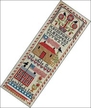 ![]() One Nation Under God - Liberty This is quite the piece by Twin Peak (all the way from The Netherlands!) Stitched on 36ct (329 x 310), it'll finish approx 18 x 18 - you won't lose THIS on the wall! The pattern refers to Rustico Aida, but also Picture This Plus's Wren color... so those should give you an idea of fabric choices. It is coded for DMC or Weeks hand-dyed flosses - 18 different shades. It's really very pretty, and I especially like the big floral pots up by the words. (Do one of those if you haven't got time to stitch this whole thing!) And we love those billowing flags too! | |