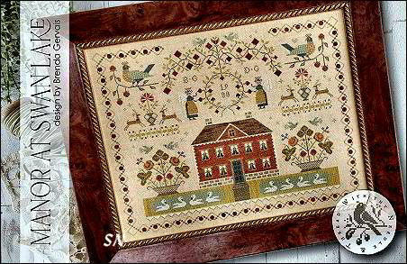 - Manor at Swan Lake - A very organized and symetric sampler, and stitched on 36ct Winter Brew, this finishes approx 15 x 12. Brenda has chosen a medley of DMC.